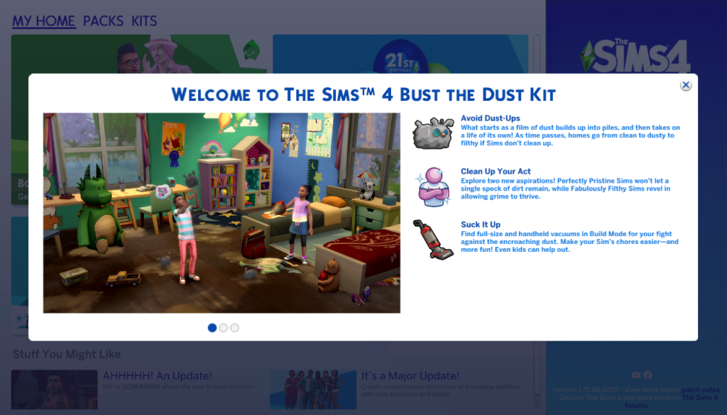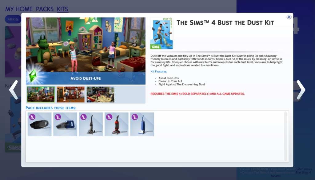 The Sims ™ 4 ile süpürgenin tozunu alın ve toplayın “Toz Kitini Patlatın!” Tozlar birikiyor ve bunun akabinde Sim’lerin evlerinde dost tavşanlar ve alçakça pis canavarlar doğuruyor. Pisliği temizleyerek bunlardan kurtulun ya da dağınık bir hayata alışın. Her toz seviyesi için yeni bufflar ve ödüller, iyi mücadeleye yardımcı olacak vakumlar ve temizlikle ilgili özlemlerle işleri fethedin.